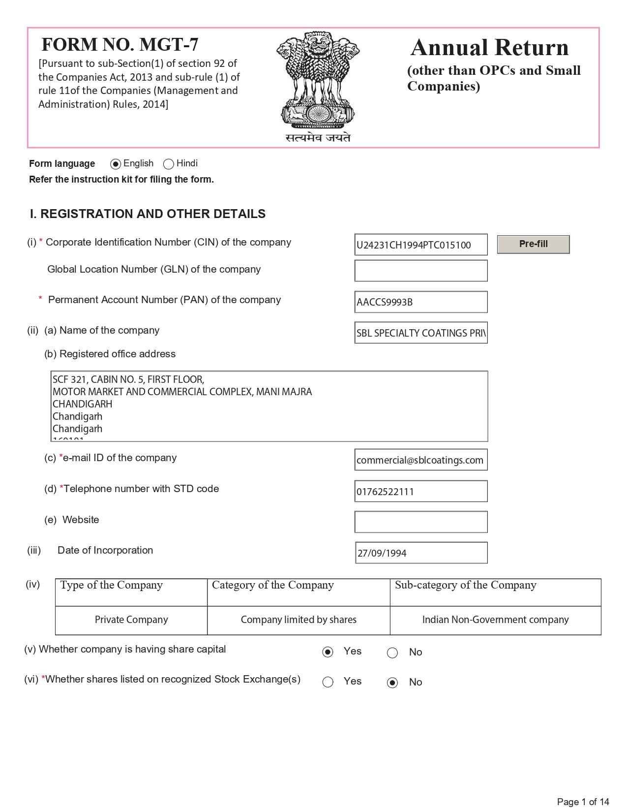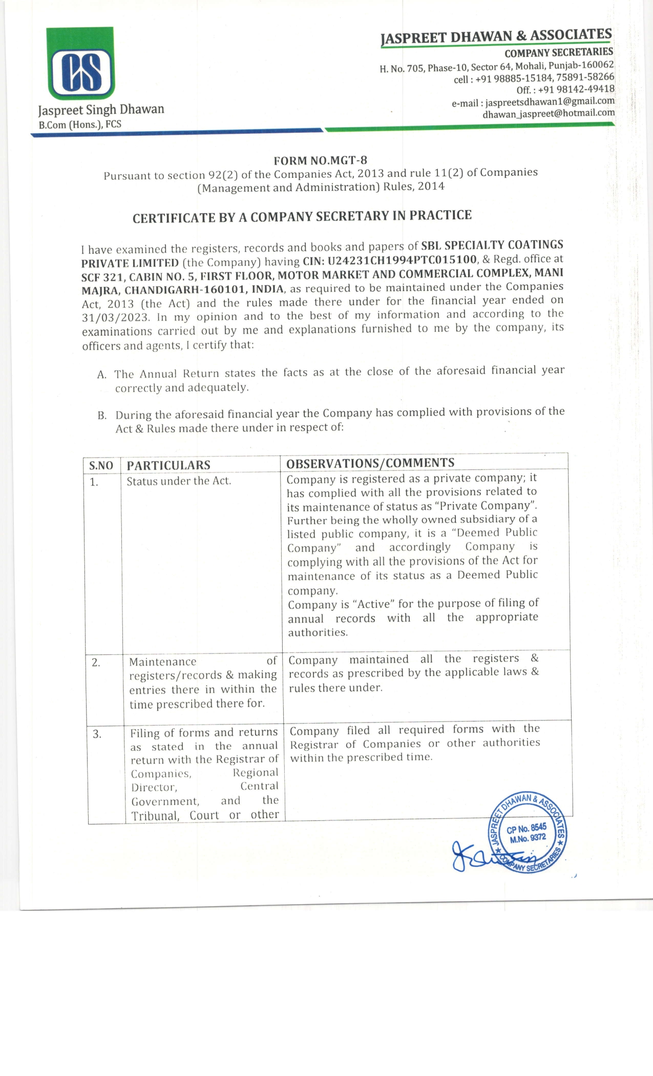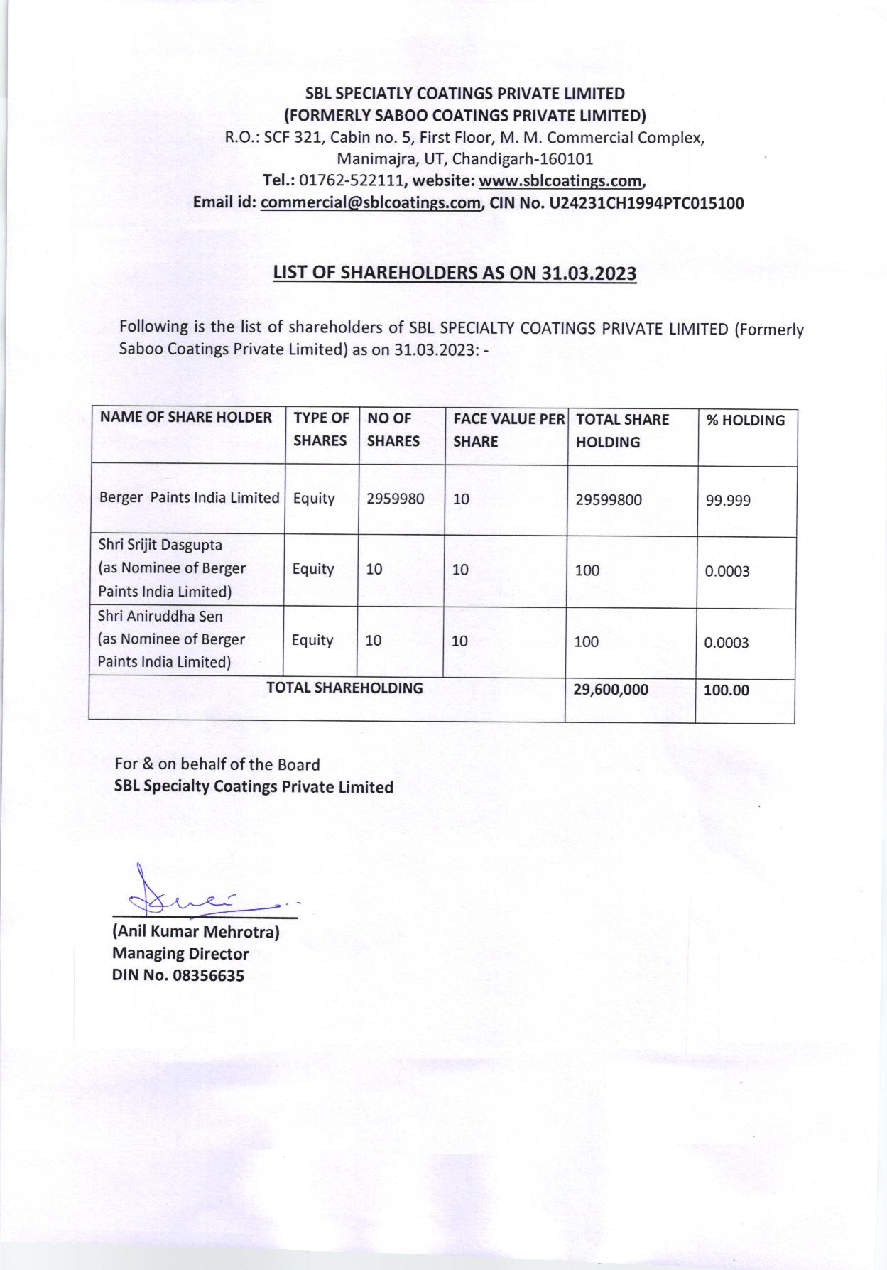 SBL Specialty Coatings Private Limited, a 100% subsidiary of Berger Paints India Limited (an Indian MNC rated the 2nd largest Paint Company in India and amongst the top 15 Paint companies of the world) manufactures Specialty Industrial Coatings formulated by leveraging Swiss technology and having manufacturing plants located in Derabassi (Punjab).